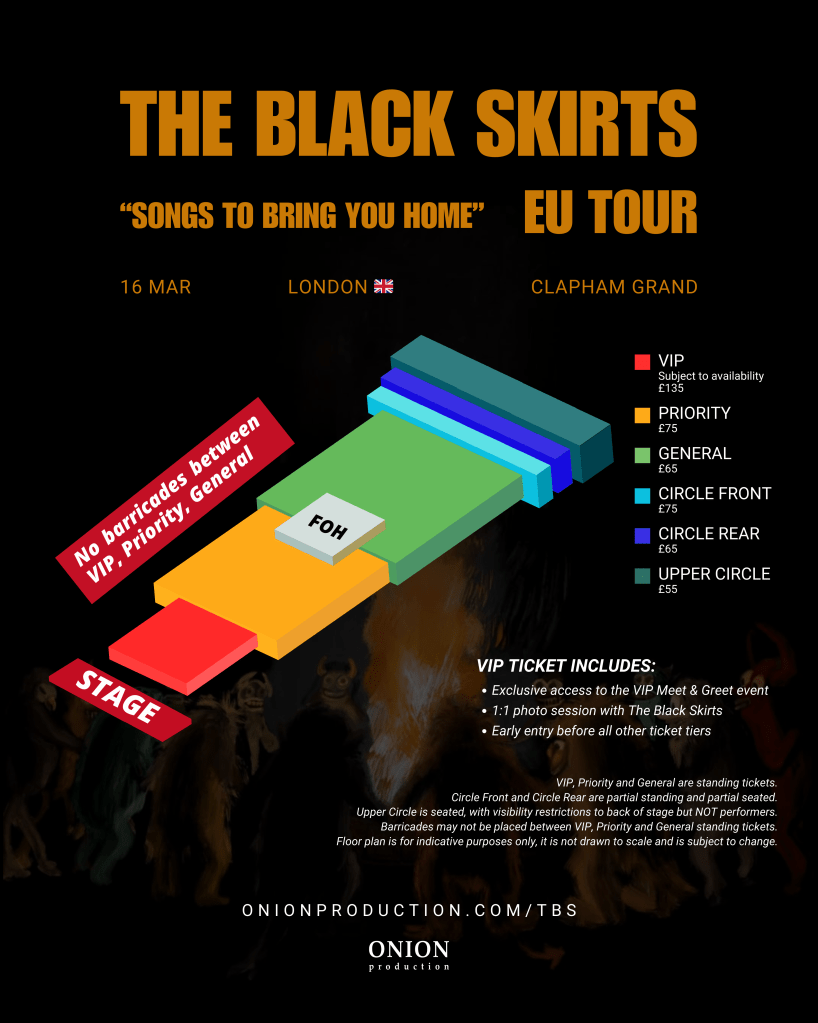 Tickets for this highly anticipated event go on sale January 27th, 2025, at 12 PM local time. Don’t miss your chance to witness The Black Skirts’ European debut – grab your tickets early at onionproduction.com/tbs before they sell out!