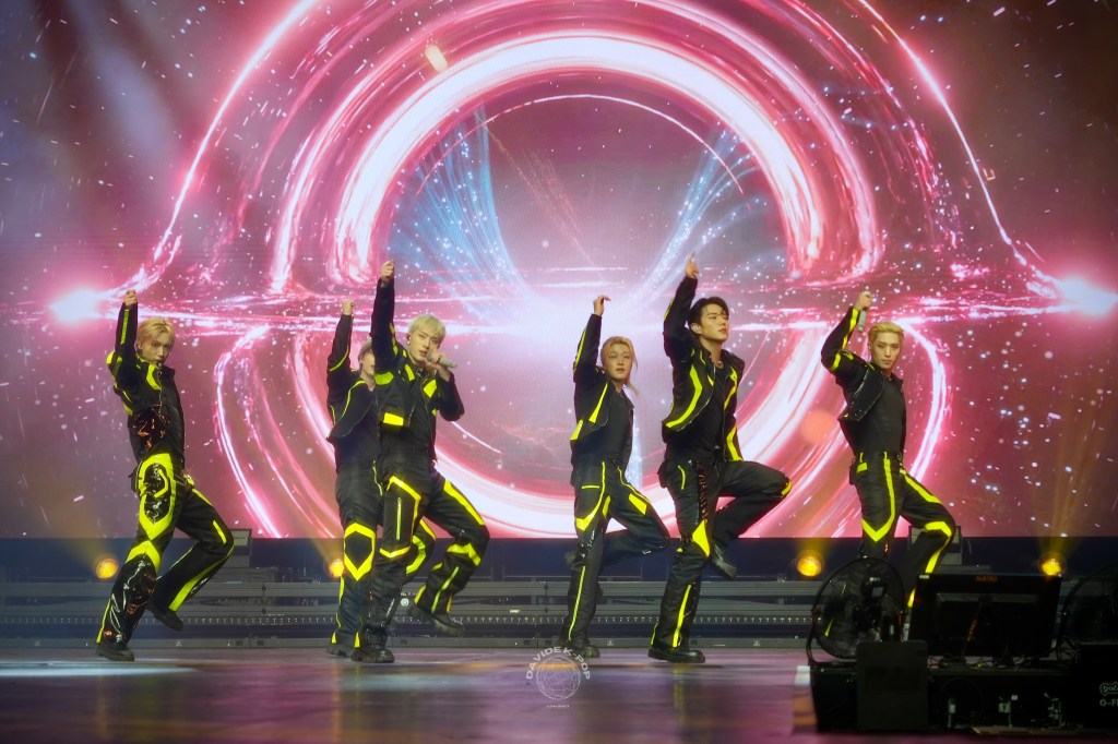The lights went down and the show was about to start. A short VR video played on the big screens and boom, flames went off as P1Harmony high-jumped onto the stage to open the show with Black Hole. They wore one of their signature looks for this tour: the black and lime green outfits. What I liked about these outfits was that the design team clearly put in a lot of effort; they were all different, yet you could see they were from the same collection. The attention to detail was unique!